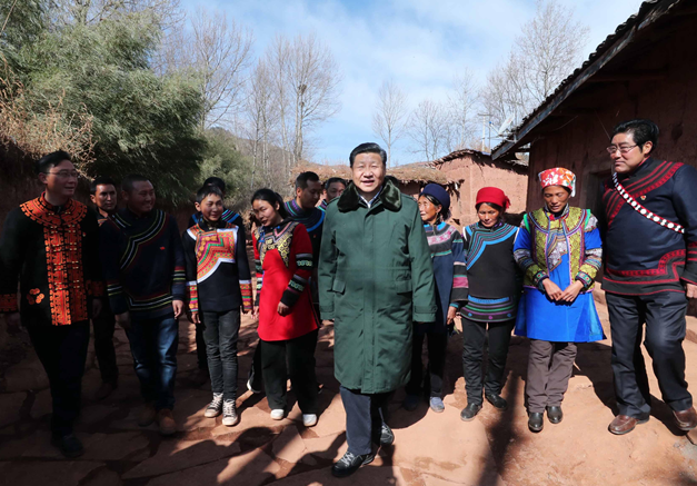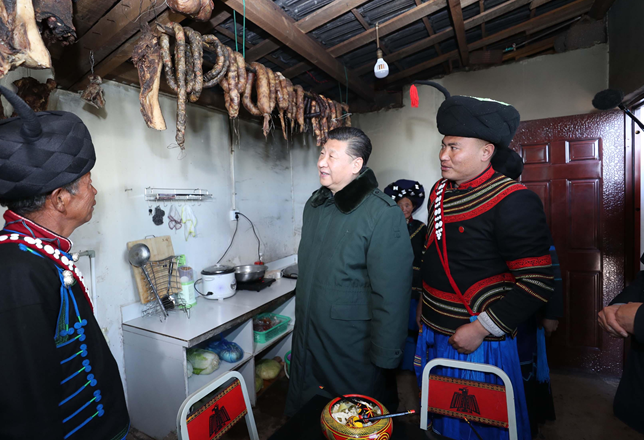 △习近平在贫困户节列俄阿尔家中与村民代表、驻村扶贫工作队员围火塘座谈