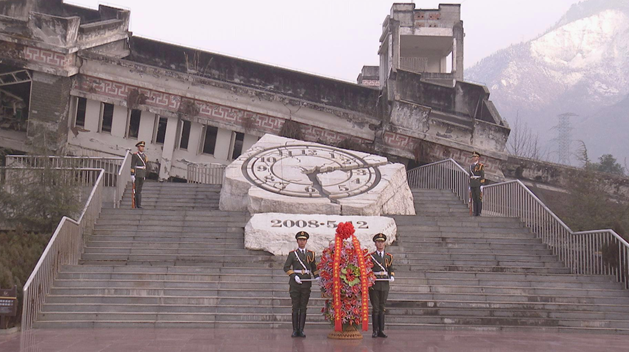 △ 这是习近平2月12日上午在映秀镇漩口中学遗址向汶川特大地震罹难同胞和在抗震救灾中捐躯的英雄敬献的花篮